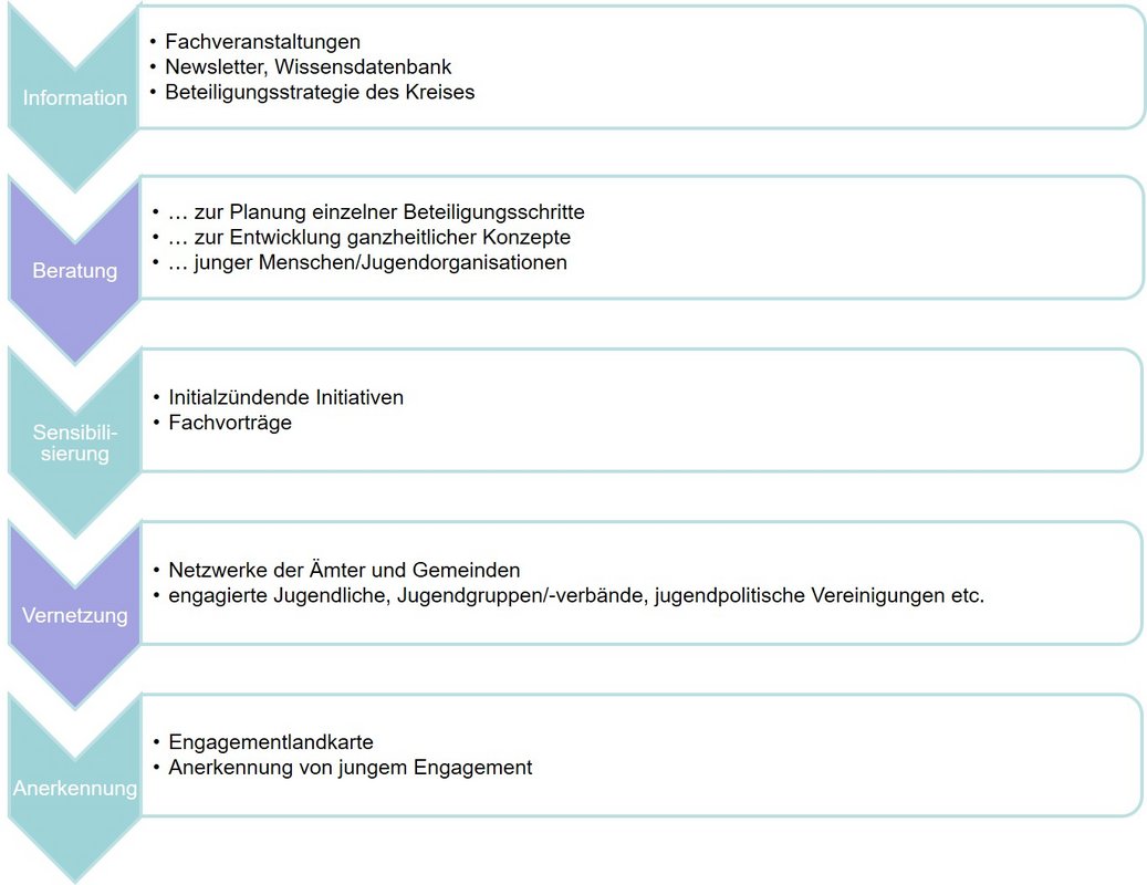 Die Referentin für Kinder- und Jugendbeteiligung macht in diesem Rahmen Angebote für Kommunen, Verwaltung und Politik sowie für Kinder und Jugendliche (und deren Verbände/Organisationen):