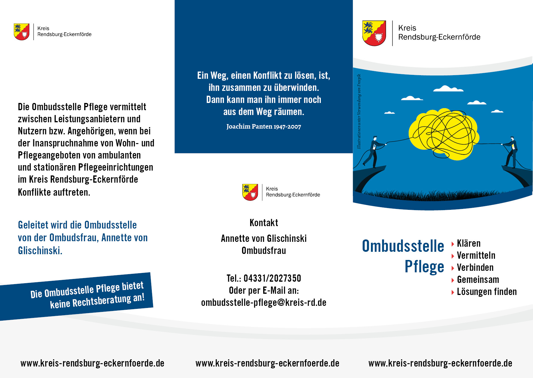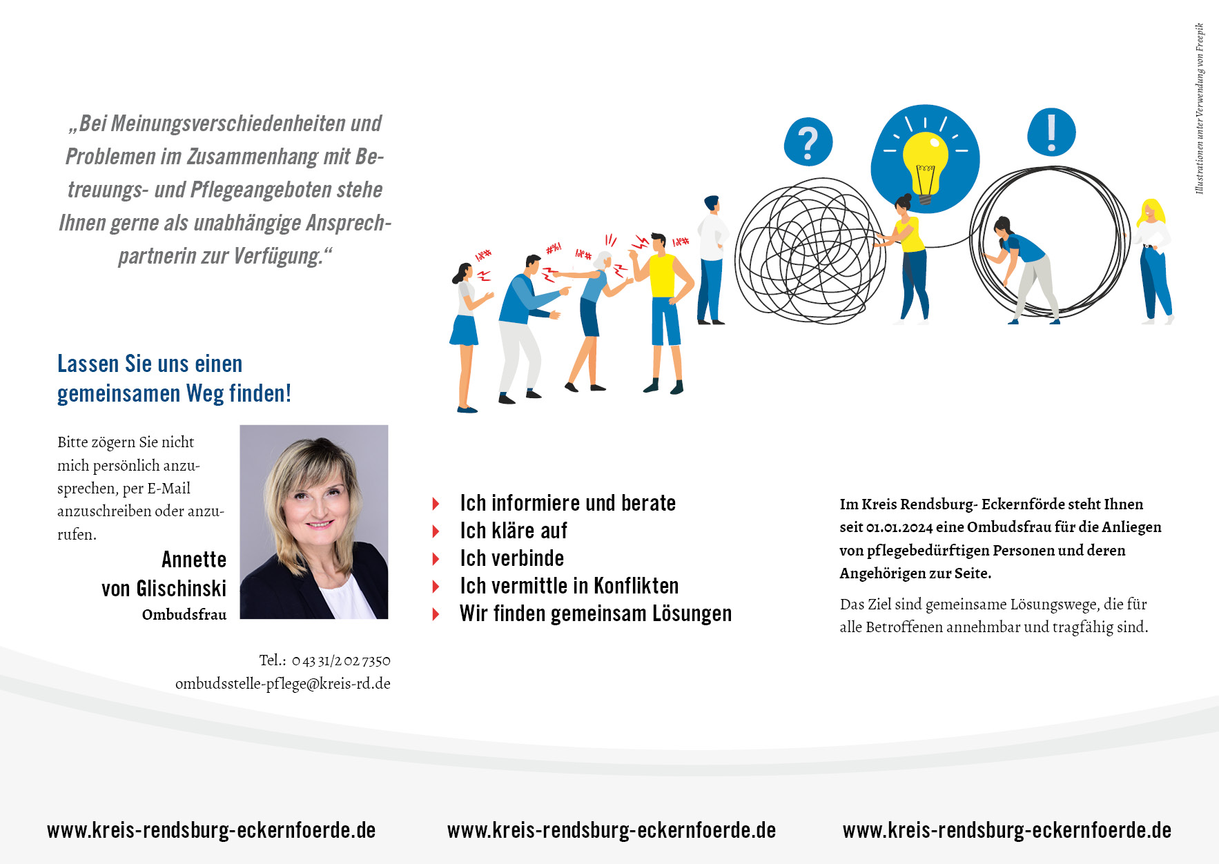 Seit dem 01.01.2024 steht Ihnen im Kreis Rendsburg- Eckernförde die Ombudsstelle Pflege zur Verfügung. Diese bietet Ihnen eine kostenlose, neutrale und unabhängige Unterstützung. Geleitet wird die Ombudsstelle von der Ombudsfrau, Annette von Glischinski.