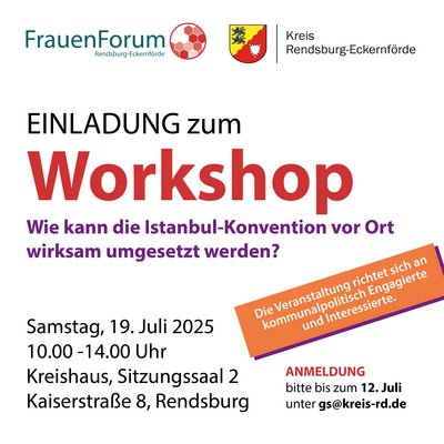 In diesem Workshop werden Ansätze zur kommunalen Umsetzung des Übereinkommens des Europarats zur Verhütung und Bekämpfung von Gewalt gegen Frauen und häuslicher Gewalt im Kreis Rendsburg-Eckernförde enwickelt.