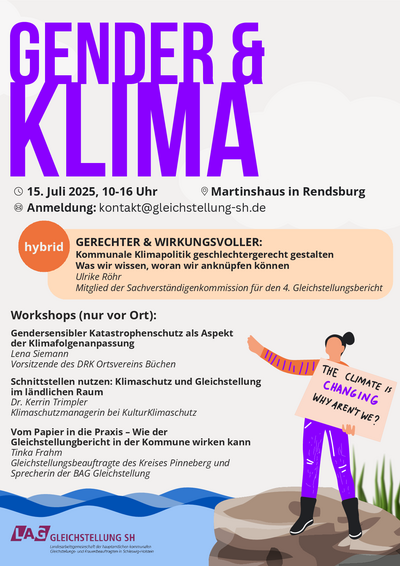 Fachveranstaltung „GENDER&KLIMA“ im Rahmen der Vollversammlung der hauptamtlichen, kommunalen Gleichstellungsbeauftragten am Dienstag, 15.7.2025 ab 10 Uhr im Tagungszentrum Martinshaus, Kanalufer 48, 24768 Rendsburg.