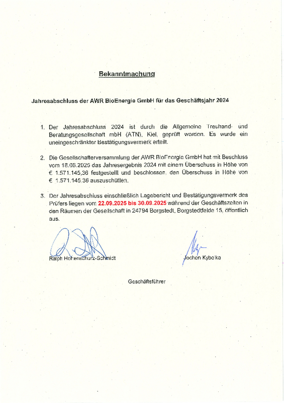 Jahresabschluss der AWR BioEnergie GmbH für das Geschäftsjahr 2024