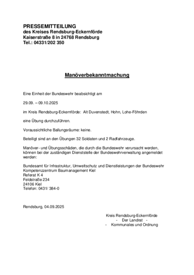 Manöverbekanntmachung (ab dem 29.09.2025 im Kreisgebiet)