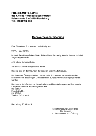 Eine Einheit der Bundeswehr beabsichtigt am 03.11. – 06.11.2025 im Kreis Rendsburg-Eckernförde: Eckernförde, Barkelsby, Waabs. Loose, Holzdorf, Vogelsang-Grünholz eine Übung durchzuführen.