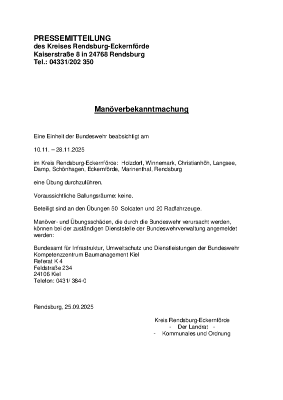 Eine Einheit der Bundeswehr beabsichtigt am 10.11. – 28.11.2025 im Kreis Rendsburg-Eckernförde: Holzdorf, Winnemark, Christianhöh, Langsee, Damp, Schönhagen, Eckernförde, Marinenthal, Rendsburg eine Übung durchzuführen.