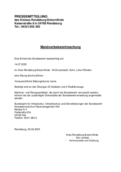 Manöverbekanntmachung (am 18.07.2025 im Kreisgebiet)